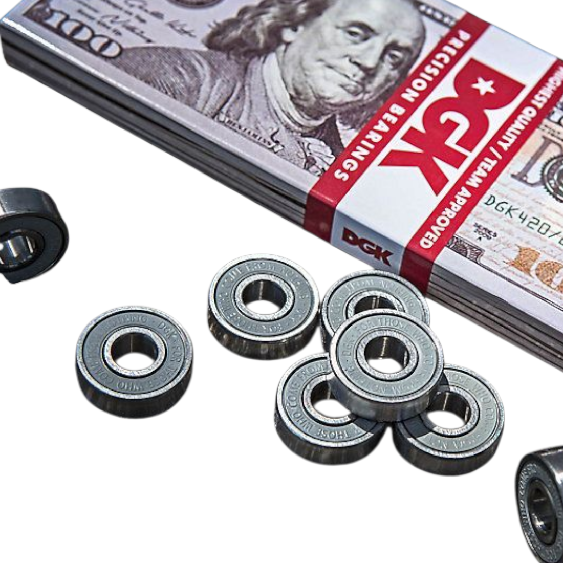 Baleros para patineta DGK Benjamins. DGK nos trae estos rodamientos ABEC 7 para que tu setup para patinar siga rodando, con cuatro espaciadores y ocho anillos de velocidad también incluidos.