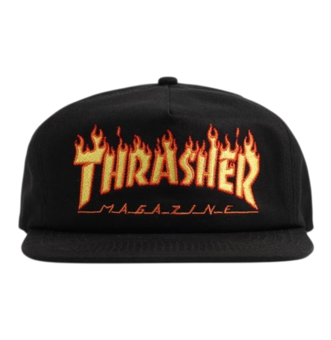 Gorra snapback de ajuste estándar, tejida en algodón. Presenta la llama distintiva de Thrasher serigrafiada en el centro. 100 % algodón.